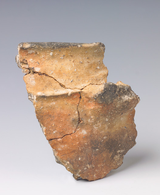 Scodellone: bordo a T inclinato all'interno, orlo non distinto dal corpo ovoide; poco sotto l'orlo è applicato un cordone orizzontale su cui è impostato l'attacco inferiore di un'ansa a nastro verticale. Impasto grezzo, superfici lisciate, l'esterna da bruno chiaro a bruno rossastro scuro a grigio scuro, l'interna nera