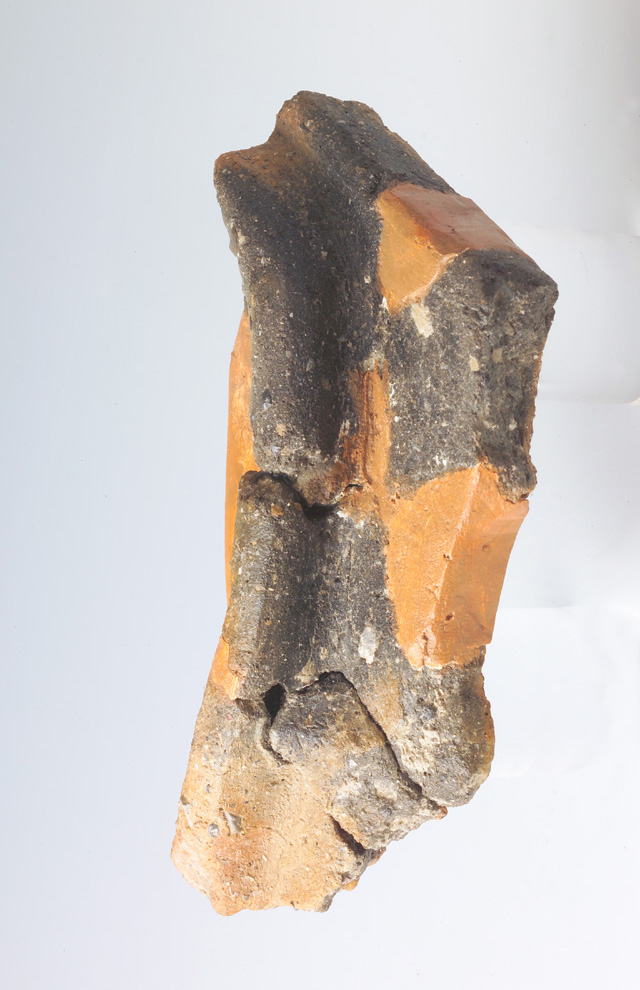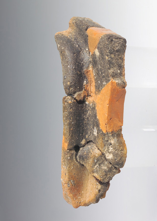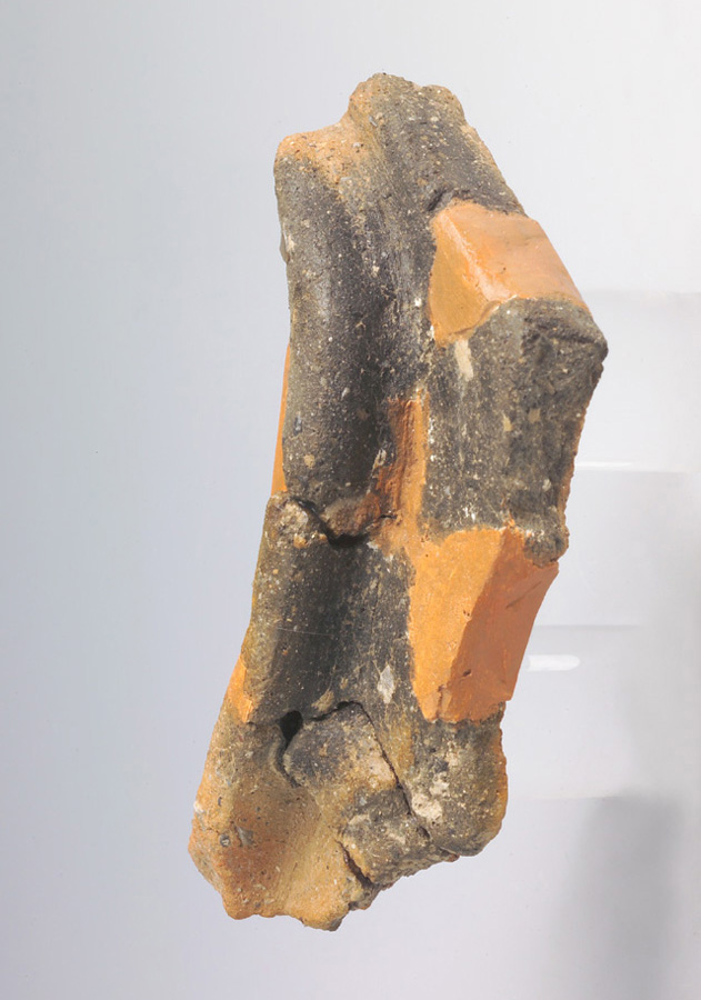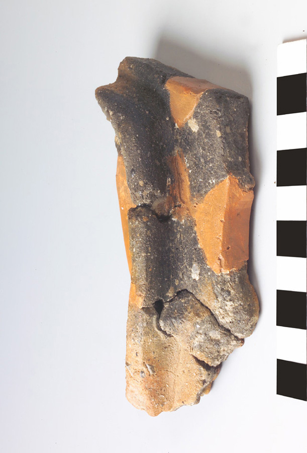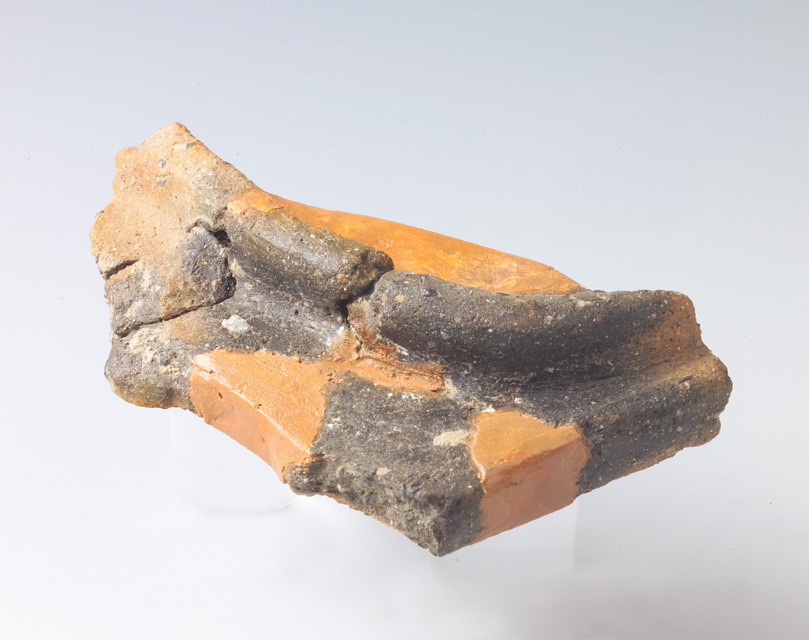 Bordo tagliato obliquamente all'interno, bilateralmente espanso, orlo non distinto dalla parete a profilo subcilindrico rettilineo, su cui è impostata una ampia presa semilunata, con apice inferiore impresso