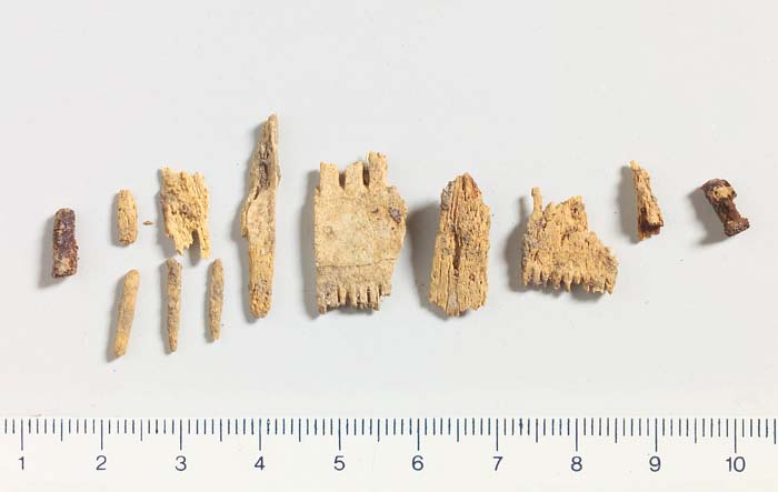 Pettine in osso frammentario del tipo a doppio filare di denti, con listelli centrali fissati da chiodini in ferro