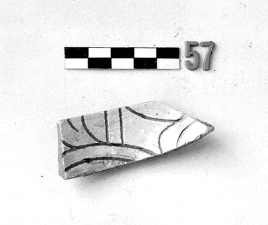 Frammento di scodella. Impasto depurato di colore arancio. Decorazione graffita a punta su ingobbio bianco, con doppio cerchio che delimita il cavetto e motivi vegetali (?) nell'incavo. Rivestita internamente di vetrina trasparente, nuda all'esterno