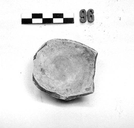 Fondo di scodella con piede ad anello. Impasto depurato di colore rosa chiaro. Internamente ricoperta da ingobbio e invetriata. Invetriatura esterna, di colore giallino, quasi del tutto asportata