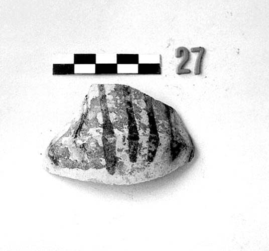Frammento di picccolo boccale a base troncoconica. Impasto depurato di colore arancio. Decorato esternamente con fasce parallele verticali in verde e manganese su ingobbio bianco dato a risparmio. Ricoperto da vetrina brunita all'esterno, trasparente all'interno
