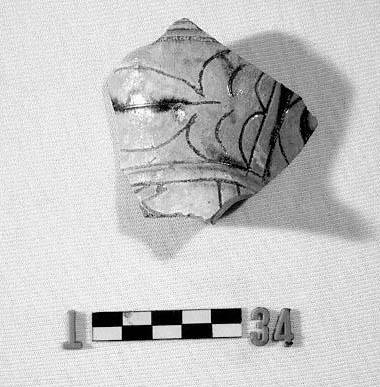 Frammento di parete di boccale. Decorazione graffita a punta su ingobbio, con motivi vegetali entro scomparti lineari. All'altezza della spalla è presente un cordoncino a rilievo
