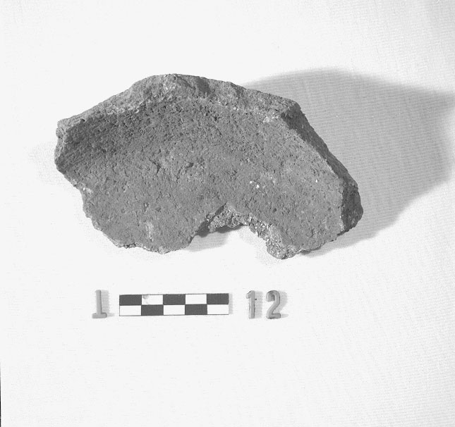 Fondo frammentario di forma chiusa (olla ?), apodo e piatto. Impasto di colore marrone scuro ricco di inclusi bianchi