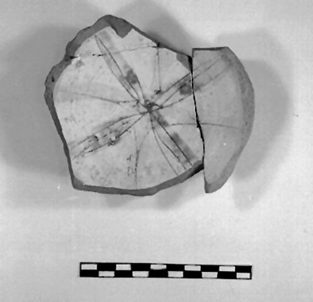 tre frammenti ricongiunti di parte centrale di ciotola graffita. L'ornato è dato da quattro lunghe foglie di color giallo, ciascuna di esse è suddivisa nel senso della lunghezza da una linea ondulata. questo motivo si sovrappone a uno geometrico formato da una stella a quattro punte. I colori utilizzati sono il giallo e il verde su fondo bianco. Il cercine è a sezione trapezoidale, il fondo presenta l'umbone.