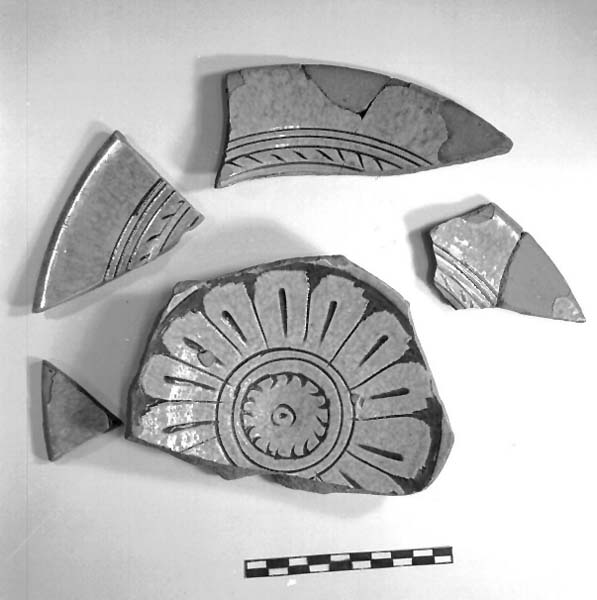 otto frammenti di cui cinque ricongiunti di un piatto graffito a punta e a stecca, a fondo ribassato e ricoperto da vetrina del tipo lionato. L'ornato del frammento della parte centrale è dato da un fiore con petali che racchiudono due cerchi concerntrici con al centro un motivo geometrico circolare. Le superfici esterne sono ingobbiate sottovetrina, sui frammenti della tesa vi sono resti di cinque cerchi concentrici e linee oblique. il cercine è a sezione trapezoidale. Presenta un fondino umbonato. Argilla rossa.