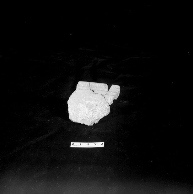 parte di olla con orlo diritto e boro appiattito, con gola poco profonda, attraversata da tre linee parallele incise, colore rosato