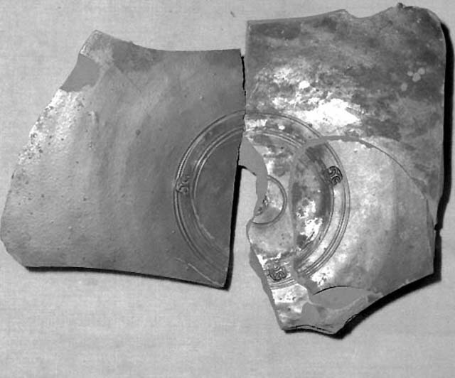 tre frammenti contigui di piatto. Forse patera del tipo Loesche 1, Dragendorf 1: fondo a sottile anello, parete a profilo piatto, in corrispondenza del fondo tre bolli con motivi a C impressi in senso diverso entro quattro solcature circolari abbinate a coppie. Lo stesso bollo è riprodotto al centro, circondato da una solcatura. Forma Lamboglia 5 o 7.