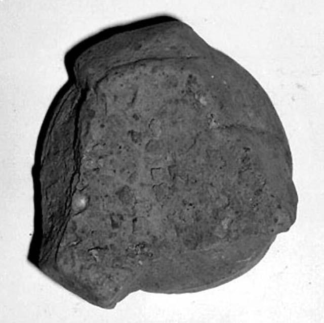 frammento di vaso di notevoli dimensioni:bordo assottigliato, fondo ad anello spesso, profilo troncoconico molto aperto. Esternamente, al centro del fondo, un umbone ben rilevato di forma conica. All'interno, sul fondo, granuli di pietrisco impressi a crudo nell'argilla. Argilla cinerognolo-scura spessa e pesante.