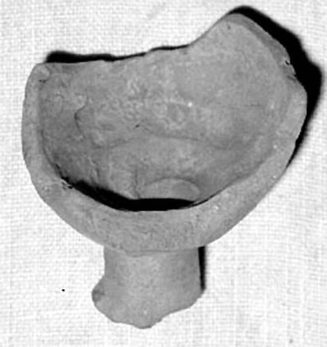 frammento di vasetto miniaturistico, forse un anforisco. Presenta un fondo a piccolo piede a forma di cilindretto, un ventre a profilo globulare, spalla e orlo sono mancanti. Si notano evidenti tracce di tornio sulla superficie interna. Argilla rosata.