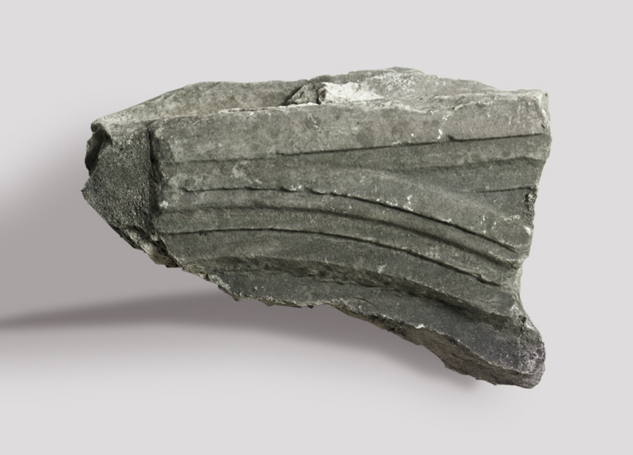 Rimane un tratto dei profili di coronamento, formati da una fascia liscia e piatta ed una gola rovescia e interrotti da un’arcata profilata, al di sotto della quale resta un tratto della parete di fondo. Lungo la superficie superiore del pezzo corre uno stretto listello rilevato per il fissaggio del coperchio.