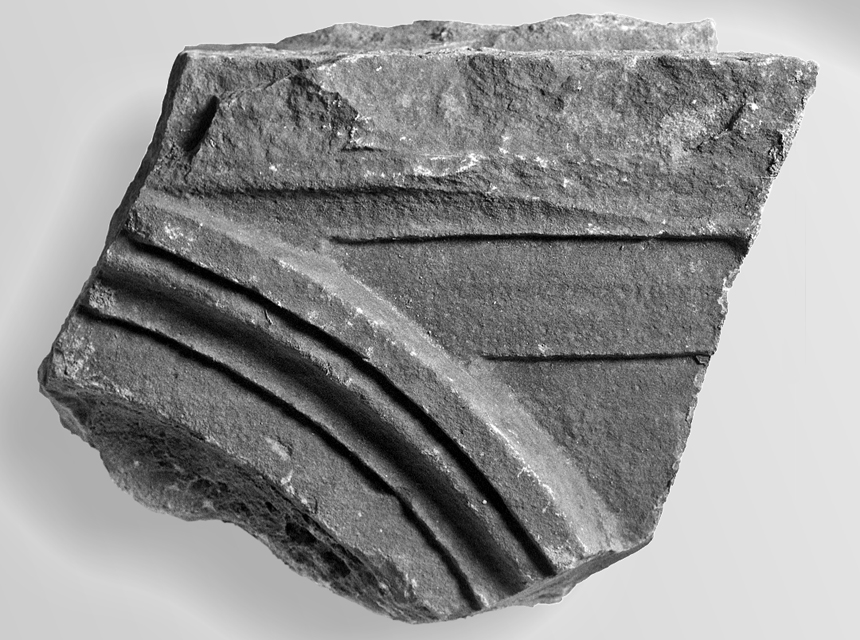 Si conserva parte dei profili del coronamento, interrotti da un’arcata e formati da gola rovescia e larga fascia piatta e liscia, al di sotto della quale rimane un tratto della parete di fondo. Lungo la superficie superiore del pezzo corre uno stretto listello rilevato per il fissaggio del coperchio.