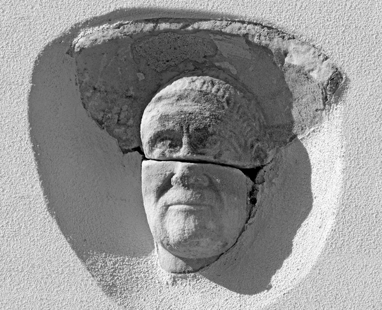 Resta il tratto superiore arcuato dell’acroterio, all’interno del quale vi è una testa maschile vista di prospetto, spezzata in due da una frattura orizzontale e conservata fino alla parte superiore del collo.