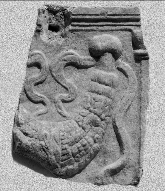Parte di uno dei lati brevi della cassa con il coronamento formato da una fascia piatta e liscia seguita da una gola rovescia, ed interrotto nel mezzo da un foro rettangolare per il fissaggio del coperchio. All’estremità destra è parzialmente conservato il pilastrino angolare con fusto liscio e capitello di forma trapezoidale rovesciata. Del rilievo resta gran parte della ghirlanda.