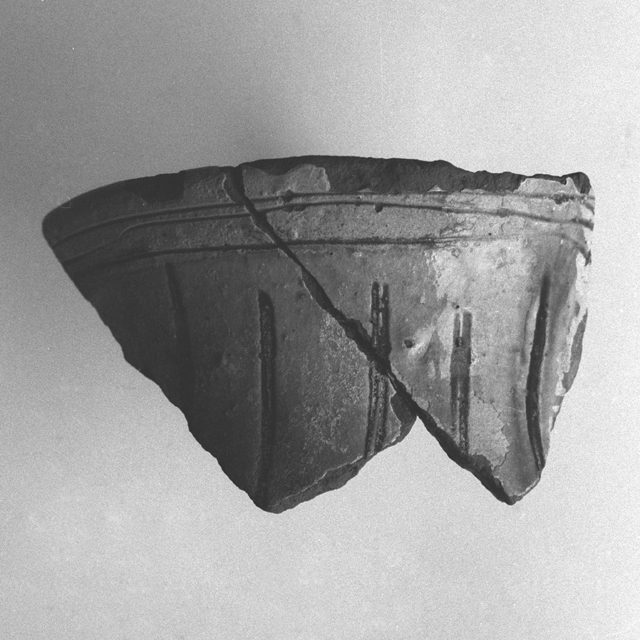 Parte del collo di un boccale, dotato di un orlo leggermente estroflesso con bordo arrotondato. La decorazione è data da linee graffite orizzontali sotto il bordo e da alcune linee graffite verticali, più larghe, sul collo. Colore giallo su fondo avorio. Vetrina ed ingobbio anche all’interno. Argilla rossa.