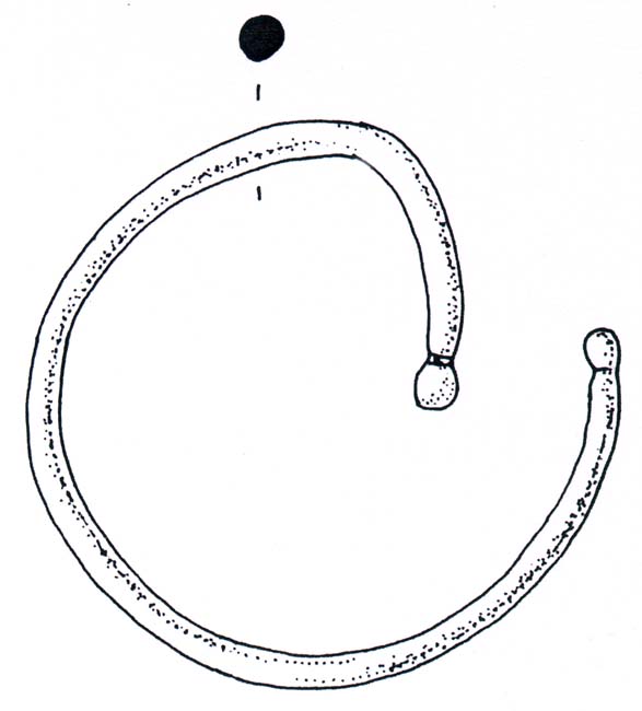 Cerchietto temporale di tipo aperto con estremità ingrossate di forma biconica; una estremità è piegata verso l'interno.