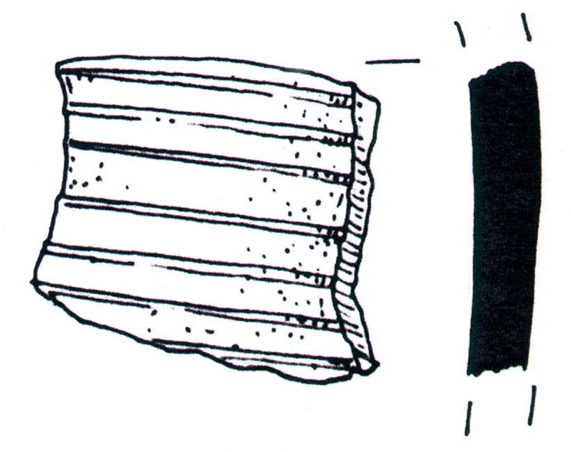 Frammento di parete di olla in ceramica grezza, impasto grigio bruno, arricchito con inclusi calcarei; decorazione a linee parallele incise in superficie.