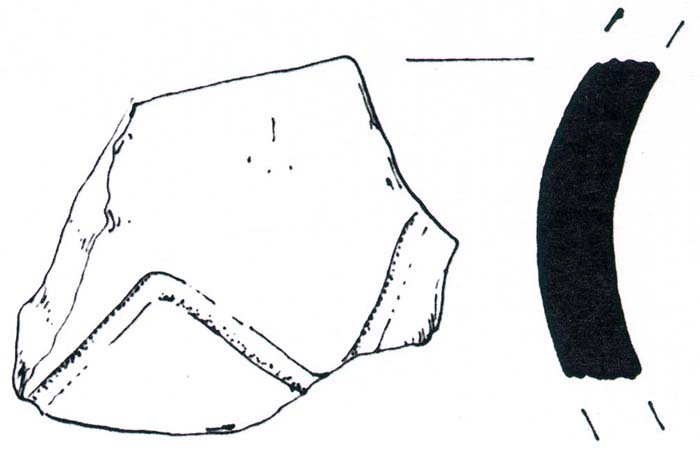 Frammento di gola di vaso decorato esternamente da una linea ondulata incisa; la ceramica grezza contiene inclusi calcarei.