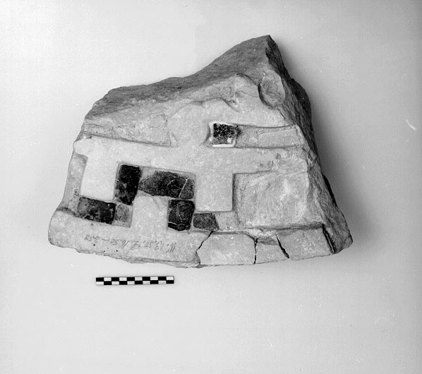 Frammento di pavimento in tarsia marmorea (opus sectile), su base di pietra grigia, che disegna una cornice curvilinea riempita da un motivo a greca. Probabilmente è parte di un pavimento a rotae della fase medievale della Basilica. Un altro frammento dello stesso pavimento ha, al posto dei marmi, dei triangoli in cotto.