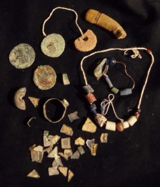Materiale rinvenuto nel sepolcreto: la collanina di perline di vetro cingeva il collo di uno scheletro. Accanto furono rinvenuti altri reperti: un orecchino ad anello di filo d'argento; un anello di bronzo con castone vuoto (scavo del 1949) diametro cm. 2,3; un sottile disco forato; tre monete (cosiddetti medi-bronzi) indecifrabili; tesserine a foglia d'oro.