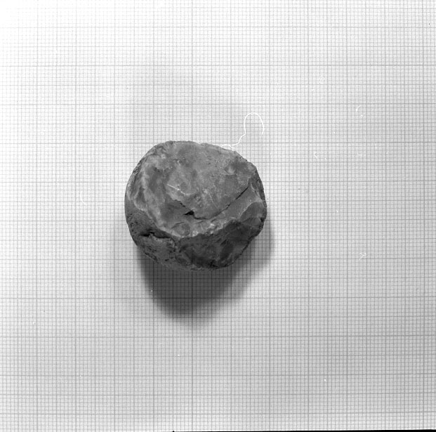 ciottolo in selce con evidenti tacche da percussione, probabile percussore. Colore rosa/giallo, con cortice E10