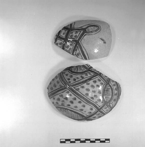 due frammenti di parete di boccale sottovetrina del tipo lionato. Nel frammento di dimensioni maggiori la decorazione è data da un motivo geometrico formato da una serie di ovuli, da una croce che suddivide la superficie in quattro quartieri nel cui interno sono graffite una serie di incisioni a piccoli solchi paralleli. Nel secondo frammento è riconoscibile una losanga tagliata a croce e un ovulo. L'interno presenta un ingobbio bianco con vetrina.