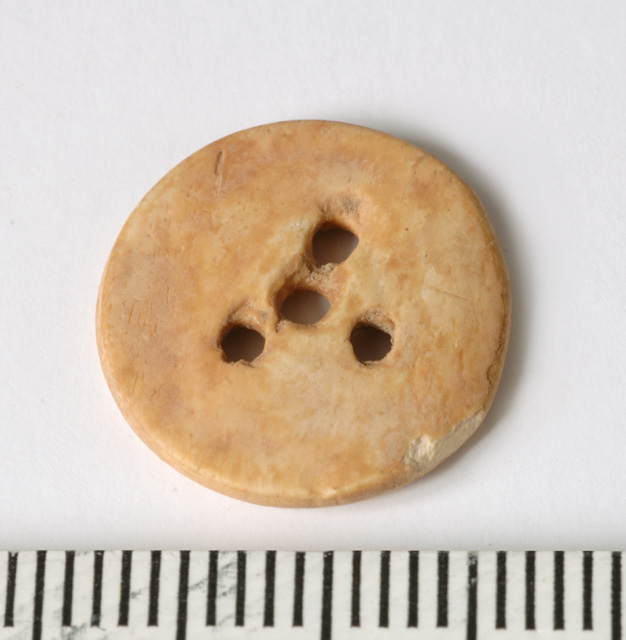 Bottone circolare a quattro fori disposti a triangolo nel centro, delimitati sul dritto da un'incisione e da un bordino a rilievo
