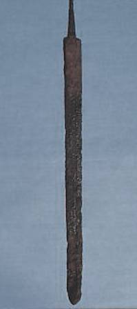 Spatha con lama a doppio taglio rastremata leggermente verso la punta ogivale; codolo piatto rastremato a sezione rettangolare e spalla dritta asimmetrica. La lama, a sezione esagonale, presenta una depressione centrale decorata a damaschinatura con motivo ornamentale a fasce di linee curvilinee disposte orizzontalmente, alternate a tratti verticali. Conserva tracce del fodero in legno e tracce di cuoio. Rinvenuta lungo il corpo dell’inumato.
