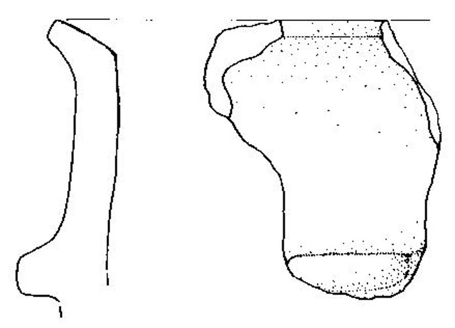 Fr. di olla ovoide, orlo a tesa non ispessita, margine appiattito, presa a lingua semicircolare impostata sotto l’orlo, dalla quale sembra dipartirsi un cordone plastico orizzontale; impasto grossolano, superficie esterna grigio-arancione, interna bruno-arancione