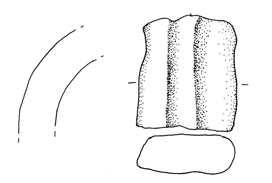 Fr. di ansa a nastro verticale, nastro stretto con doppia scanalatura irregolare verticale; impasto semigrossolano, superficie lisciata rosso arancio