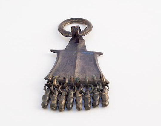 Pendaglio costituito da una lastra di bronzo pieno di forma vagamente antropomorfa con un’appendice superiore con un foro passante, due piccoli apici a destra e sinistra, lati e base leggermente ricurvi. La base presenta 8 piccoli fori. I margini, la linea orizzontale che unisce i due apici, e la linea centrale sono rilevati. Il pendente, è legato, tramite una piattina bronzea, attraverso il foro superiore, ad un anello di sospensione di bronzo, a sezione ellittica. Dagli 8 fori, lungo la base, pendono 8 pendenti a batacchio con ispessimento centrale, legati tramite un incatenamento di due anellini di verga bronzea. Fuso a matrice. Superfici lisce e patina lucida di colore verde scuro. Integro.