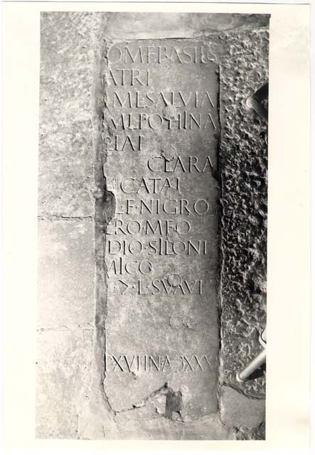 fronte: [---]o M(arci) f(ilio) Basilo / [p]atri, / [---] M(arci) l(iberta) Salviaẹ, / [---] M(arci) l(ibertae) Poṭ̂^hina[e / fi]liai(!), / [---] Clara[e / de]ḷicatai(!), / [---] L(uci) f(ilio) Nigro / [gen]ero mẹo, / [---]idio Siloni / [a]mico, / [---] ((mulieris)) l(iberto) Suavi. / [In f(ronte)] p(edes) XVI, in a(gro) p̣(edes) XXXI[I].