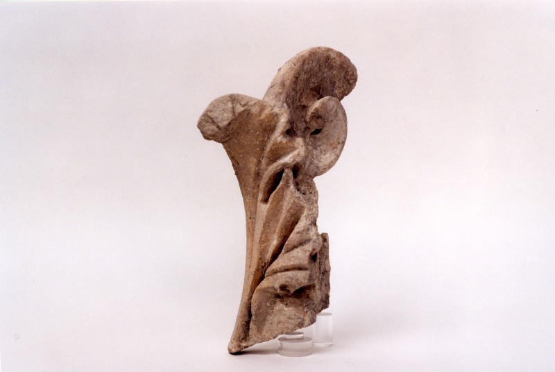 Frammento di capitello corinzio di tipo asiatico, di cui si conservano una volta e parte della foglia d'acanto angolare. Nel sito delle Grandi Terme ma in un'altra unità stratigrafica, è stato rinvenuto un ulteriore frammento di capitello corinzio asiatico di simile fattura (cfr. scheda RA 19445).