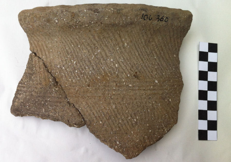 Questo tipo di grosse olle, caratterizzata da uno spessore consistente della parete, da una decorazione composta da fasci di linee parallele e verticali su tutto il corpo e sulla parte interna dell'orlo, e da un impasto grigiastro con abbondanti inclusi calcitici, trova molte attestazioni in regione, in particolare in contesti di epoca augustea. In alcuni casi anche l'orlo è decorato, con pizzicature. Tale genere di recipiente era probabilmente destinato alla conservazione degli alimenti, poiché in nessun caso è stata rilevata la presenza di annerimento da fuoco.