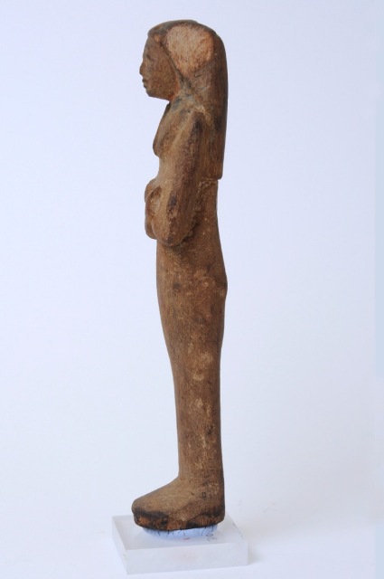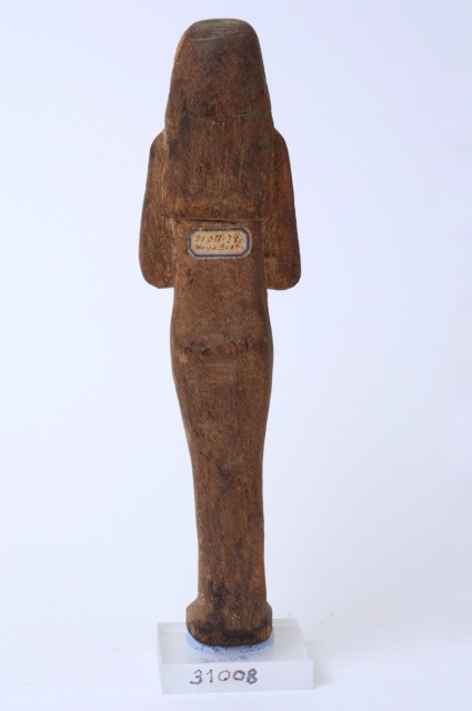 Statuina funeraria in legno (forse sicomoro) mummiforme che indossa una parrucca doppia, sulla cui parte frontale si intravedono tracce di nero. Le braccia sono incrociate, la destra sopra la sinistra; le mani non reggono attrezzi. Non presenta iscrizioni, probabilmente a causa della perdita della pittura originale.