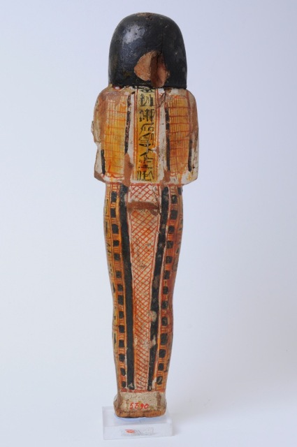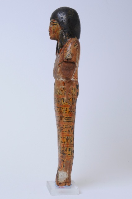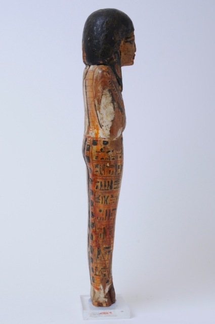Statuina funeraria mummiforme che ha lo sfondo giallo e i particolari, che coprono quasi interamente la statuina, resi in rosso e nero. Indossa una parrucca doppia dipinta in nero ed un collare. Le braccia sono incrociate e in ciascuna mano si intravede una zappa disegnata in rosso. Dietro le spalle due grandi sacche rosse con contorno nero. Tra di esse si trova una colonna di iscrizione con nome e titoli del defunto. Sotto, dietro le gambe, sono delle decorazioni geometriche. La punta dei piedi è mancante. Attorno alle gambe corrono otto righe di iscrizione, che riportano il testo del capitolo 6 del Libro dei Morti. Qui i titoli del defunto sono riportati in maniera leggermente diversa rispetto alla colonna sulla schiena.