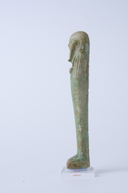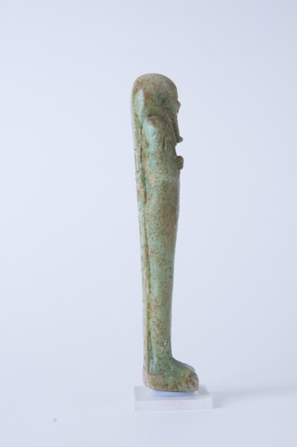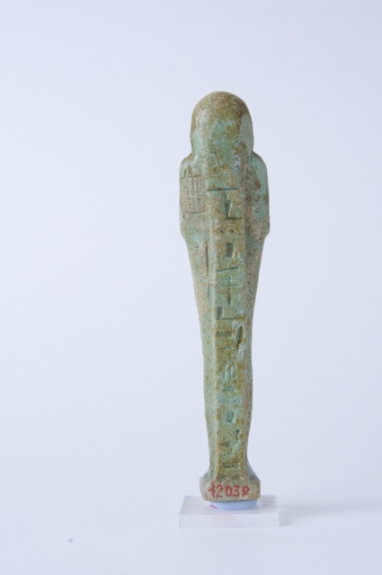 Statuina funeraria mummiforme che indossa una parrucca tripartita e la barba divina intrecciata. Le mani sono incrociate ed affiancate, la destra sopra la sinistra, e tengono rispettivamente una zappa e un piccone. Dalla spalla sinistra pende una sacca. Il pilastro dorsale forma un tutt’uno con la piccola base. L’iscrizione è costituita da una colonna sul pilastro dorsale.