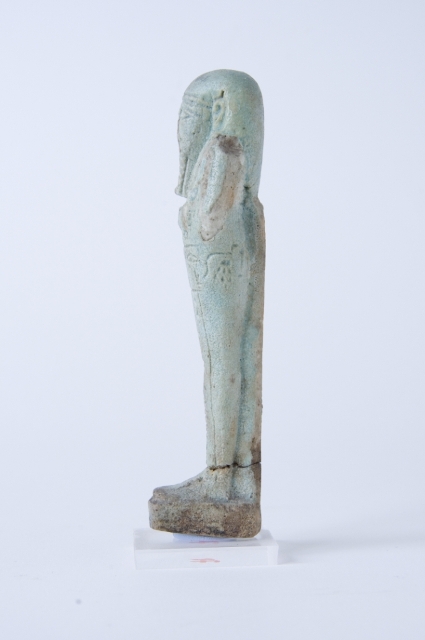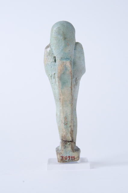 Statuina funeraria mummiforme, che presenta una frattura all’altezza dei piedi e indossa una parrucca tripartita con fermagli e la barba divina intrecciata. Le mani sono incrociate, la destra sopra la sinistra, e portano rispettivamente una zappa e un piccone. Dalla spalla sinistra pende una sacca. Il pilastro dorsale e la base sono presenti. L’iscrizione si trova sulle gambe dell’ushabti ed è a forma di T.