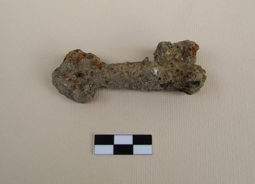 Chiave Bernarda in ferro con canna a sezione circolare, presa a disco a sezione triangolare con foro circolare centrale, munita di ingegno rettangolare, attaccato per tutta l'altezza alla canna, del quale non sono leggibili gli intagli poiché mineralizzato.