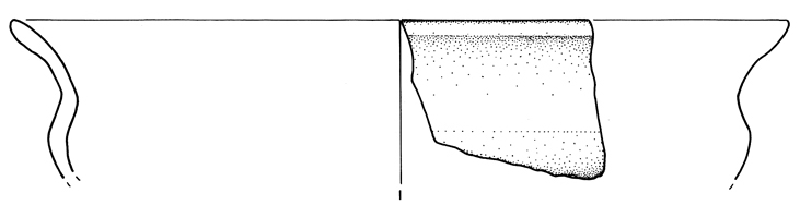 Fr. di tazza carenata: Margine arrotondato, orlo appena svasato esternamente leggermente ispessito, parete svasata fortemente concava, con profilo angolare, carena angolata, accenno di vasca mediamente profonda; impasto semifine, superfici lisciate bruno grigiastro e grigio chiaro.