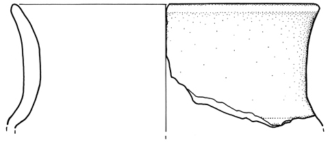 Fr. di tazza carenata: Margine arrotondato, breve orlo svasato a profilo continuo con l’ampia parete concava verticale, carena angolata; impasto semifine, superfici lisciate bruno scuro.