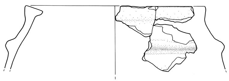 Fr. di olla ovoide: margine tagliato obliquamente all’interno e bilateralmente fortemente espanso, ampia spalla inclinata arcuata su cui è impostato u cordone orizzontale a sezione semicircolare; impasto semigrossolano, superfici lisciate bruno e bruno rossastro.