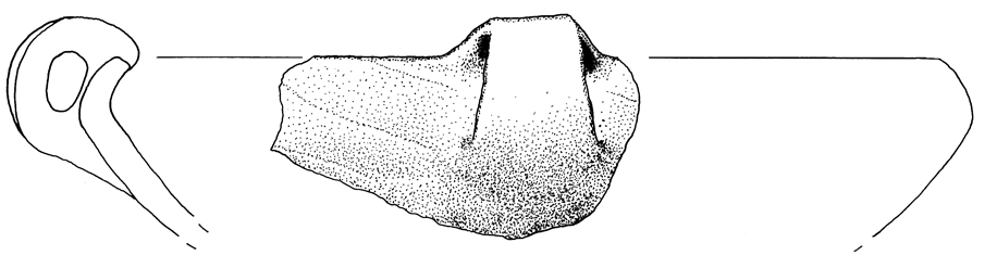 Fr. di scodella a orlo rientrante: margine tagliato obliquamente all’interno, breve orlo rientrante a profilo continuo con la spalla arrotondata, entrambi modellati da leggere costolature oblique, vasca a profilo troncoconico di media profondità; sull’orlo e la massima espansione è impostata un’ansa a nastro leggermente rastremata, con attacco superiore internamente aggettante; impasto semifine, superfici accuratamente lisciate nere.