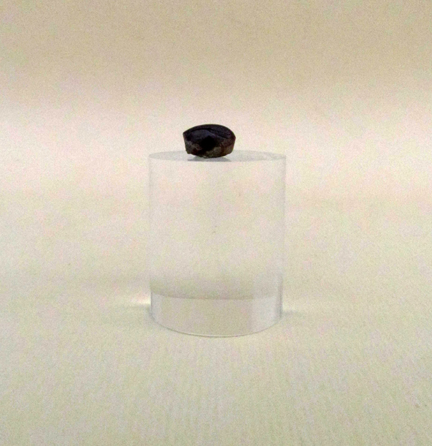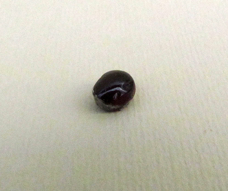 Granato almandino rosso, con taglio cabochon (forma con superficie convessa e base piatta), a profilo subcircolare, probabilmente relativo a castone di anello.