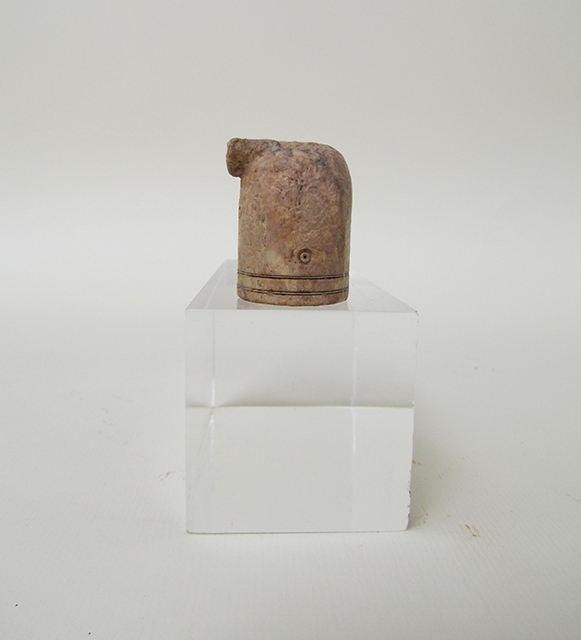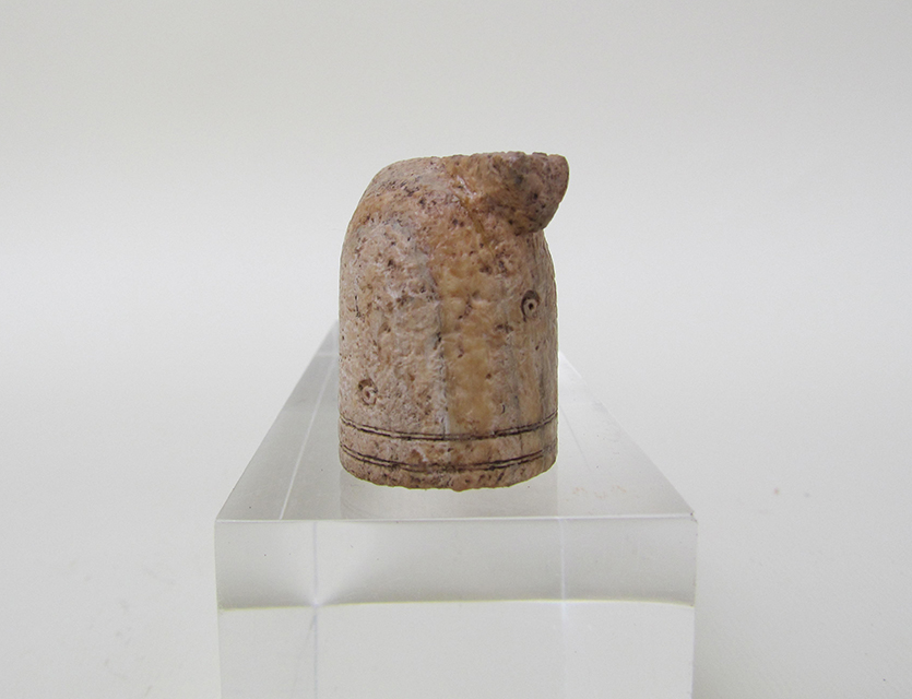 Pezzo del gioco degli scacchi ricavato da corno animale. Presenta una lavorazione accurata, forma cilindrica arrotondata e base piatta. La parte superiore è caratterizzata da una protuberanza. La superficie inferiore è decorata da due linee parallele orizzontali incise, mentre la parete e la calotta sono decorate da incisioni circolari ("occhi di dado"). Può essere identificato come un Alfiere o un Cavallo.