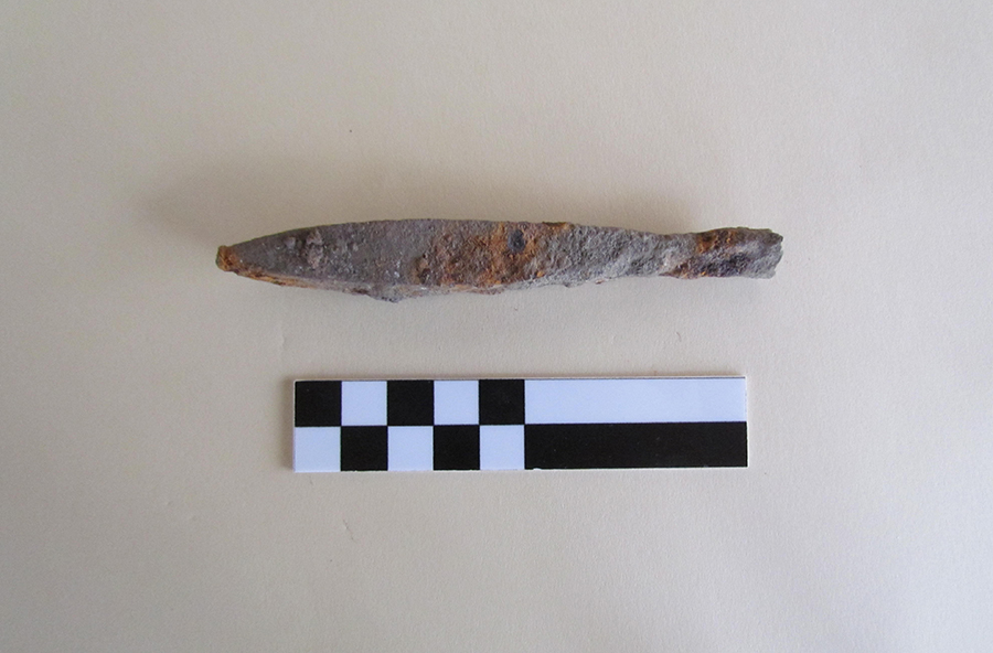 Cuspide di proietto per arma da corda, dotata di innesto a gorbia, fornita di punta piramidale a sezione romboidale, piuttosto allungata, dal collo poco distinto. Il ferro è piuttosto massiccio.