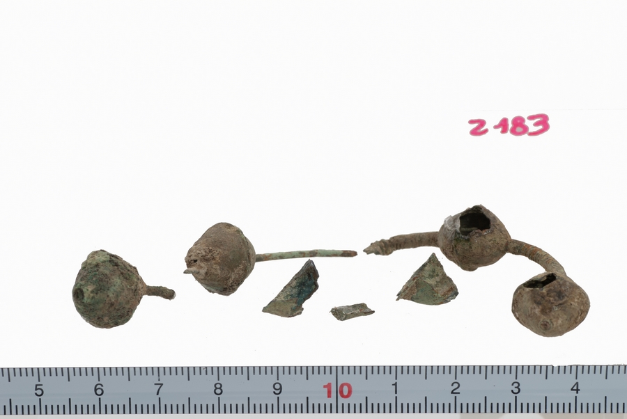 Cerchietto temporale a cerchio con elementi ornamentali a doppio cono, cosiddetto "three-bead" ring. Cerchio, ad andamento leggermente ovale, a sezione circolare con estremità desinenti rispettivamente a gancio e a linguella appiattita e ricurva per il fermo. La metà inferiore del cerchio era decorata da tre motivi a doppio tronco di cono con foro pervio centrale (costituiti ognuno da due elementi accostati per la base a bordo ispessito; l'elemento di sinistra ha perduto la metà inferiore); tra un elemento e l'altro il cerchio è arricchito da un filamento bronzeo strettamente avvolto a spirale in modo da fungere ad un tempo da fermo e da elemento ornamentale.