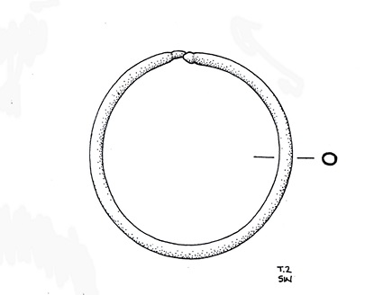 Cerchietto temporale, rientrante nel cosiddetto "finger-ring" type. Filo ingrossato e a sezione circolare, con estremità nettamente sagomate e modanate con ingrossamento singolo. Forma circolare.