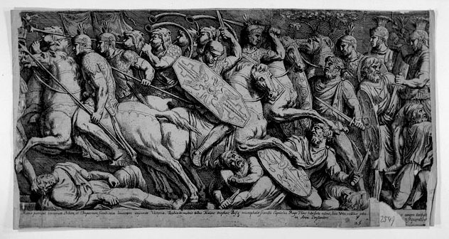 in basso sotto il campo figurato, n. 25: Romae porrigit terrarum Orbem, et Imperium, fronti eius laureum inijcienteVictoria. Dacica te nutrit tellus Traiane tropheis Bisq. triumphato scandis Capitolia Rege Hinc tibi serta nitent, hinc Urbe redditur orbis./ in Arcu Constantini