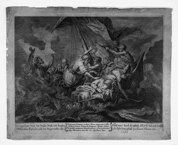 in basso a sinistra sotto il campo figurato: Der ungestüme Wind, der Wellen Muth, und Krachen,/ Wekt unsern Heiland nicht; die Jünger weken ihn,